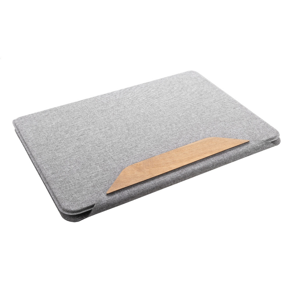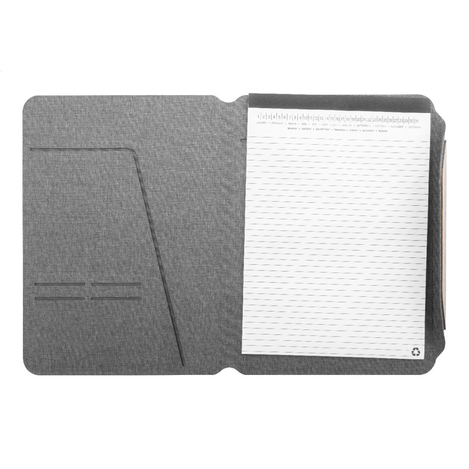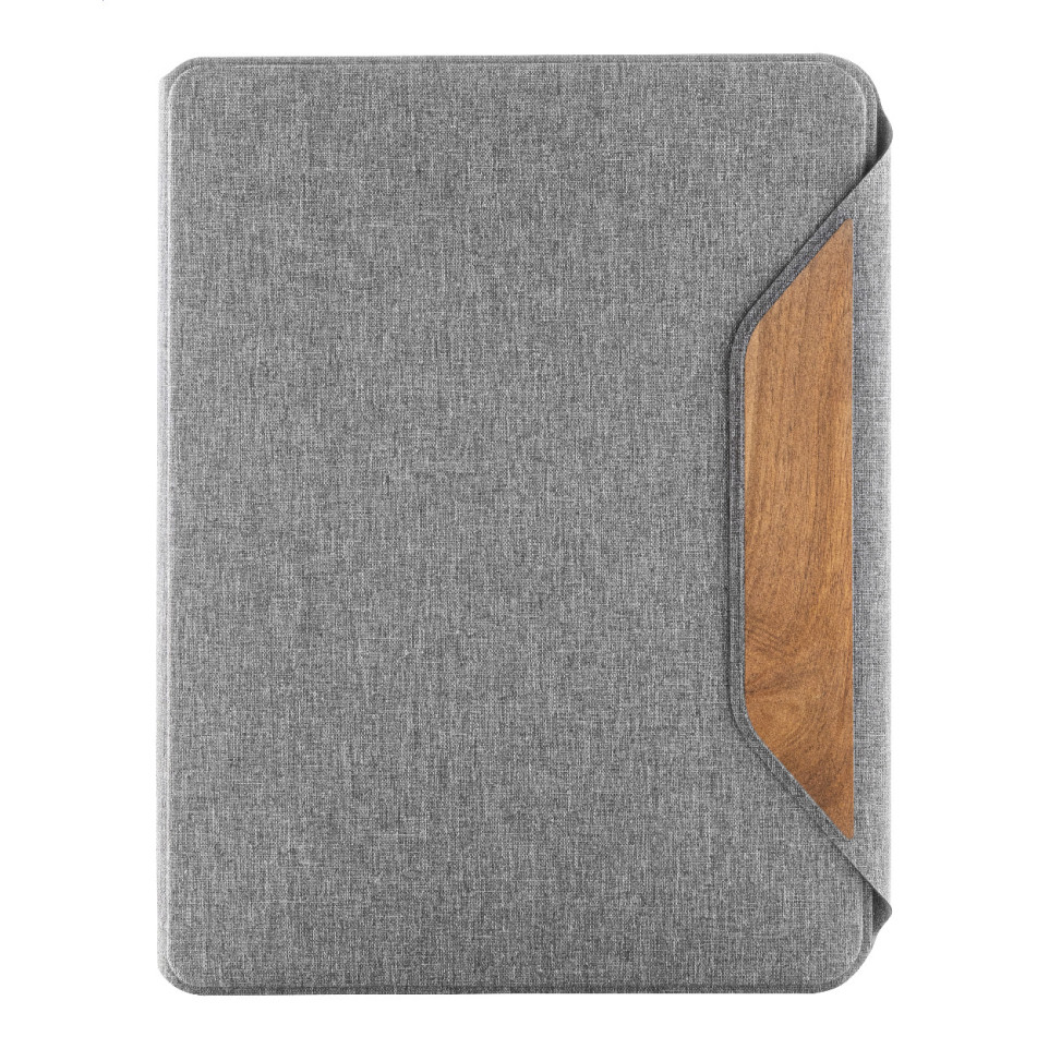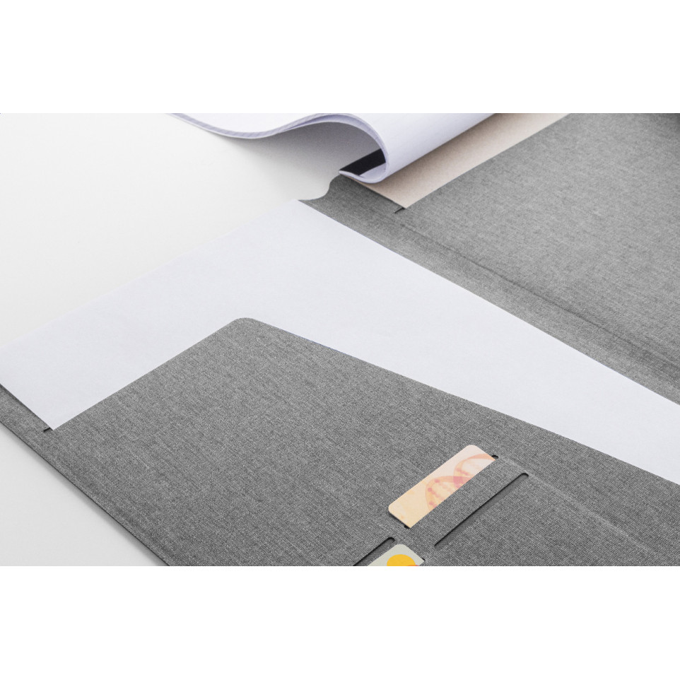 Porte-documents A4 en polyester RPET gris, idéal pour les conférences, réunions ou déplacement professionnel. Organisez vos documents grâce à ses multiples pochettes intérieures et sa fermeture magnétique élégante agrémentée de détails en bois de noyer.