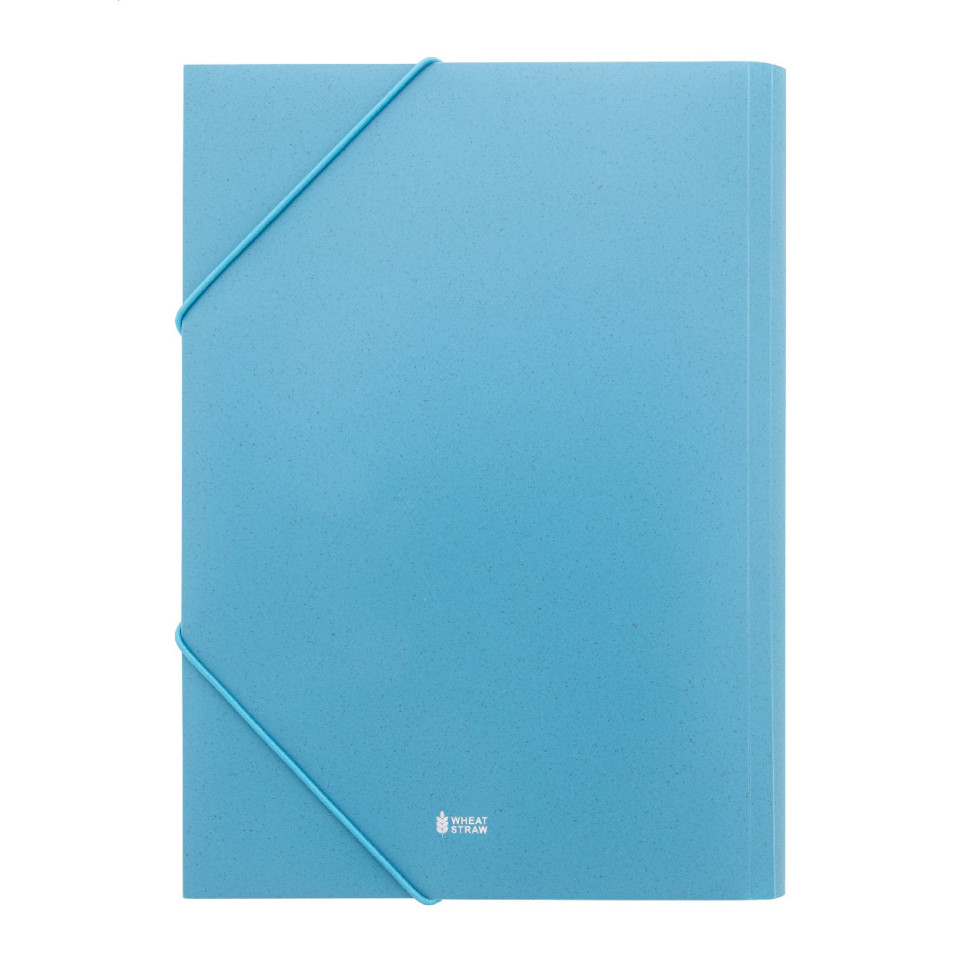 Porte-documents bleu écologique, conçu en paille de blé, doté de sangles élastiques pour maintenir vos dossiers, notes ou supports de présentation organisés lors de réunions, formations, conférences ou déplacements professionnels.