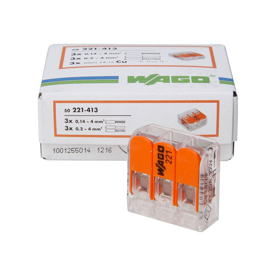 Borne rapide avec levier Wago 2 x 0,2-4 mm², conditionnée en boîte de 100 pièces, conçue pour la connexion rapide, fiable et sécurisée de deux conducteurs électriques rigides ou souples dans des installations résidentielles, tertiaires ou industrielles.