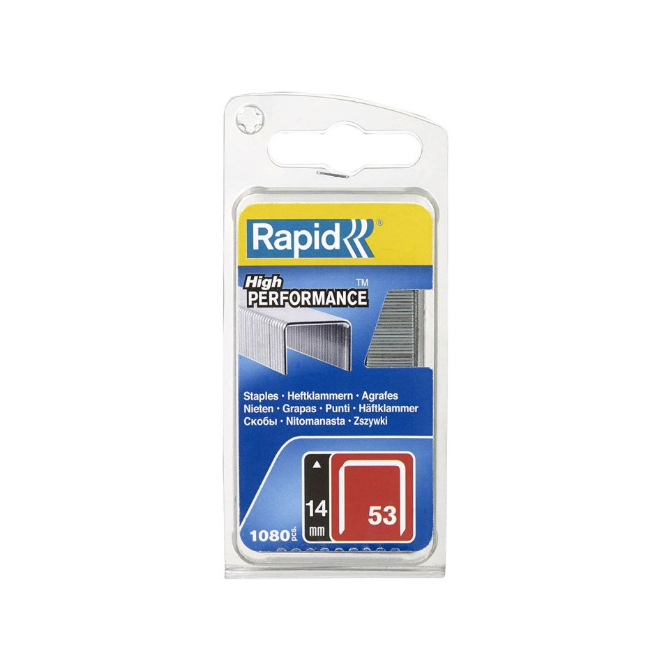 Agrafes TYPE 53 Rapid, longueur 14 mm, conditionnées par 1080 pièces, conçues pour fixer solidement textiles, toiles, cuir, matériaux décoratifs, étiquettes ou posters avec discrétion et efficacité. Adaptées autant aux travaux de bricolage qu’aux usages professionnels.