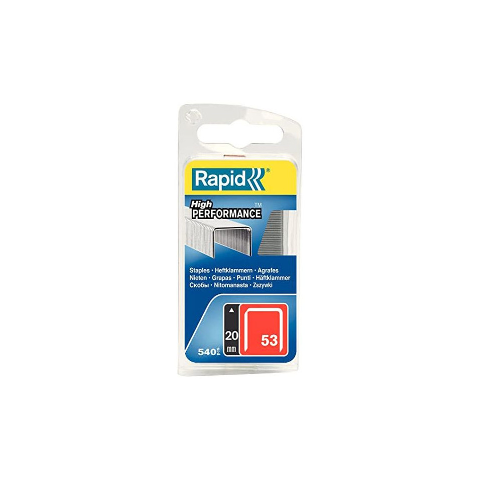 Agrafes TYPE 53 de 20 mm, boîte de 540 pièces, conçues par Rapid pour la fixation précise de textiles, bois, matériaux décoratifs ou étiquettes, compatibles avec de nombreuses agrafeuses de marques différentes.