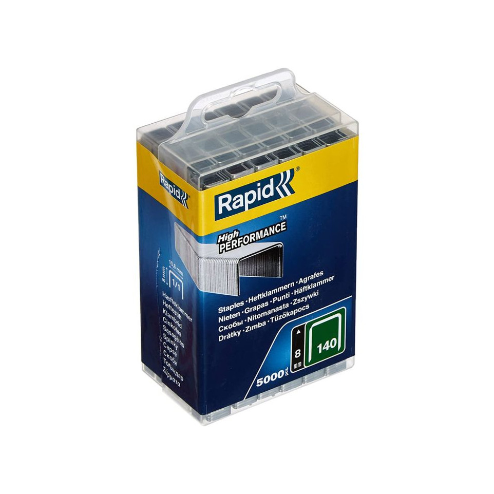 Agrafes TYPE 140 8mm de la marque Rapid, conditionnées en boîte de 5000 pièces, destinées aux travaux de fixation variés, compatibles avec de nombreuses agrafeuses manuelles, électriques et pneumatiques dans le secteur du bricolage ou de l’artisanat.