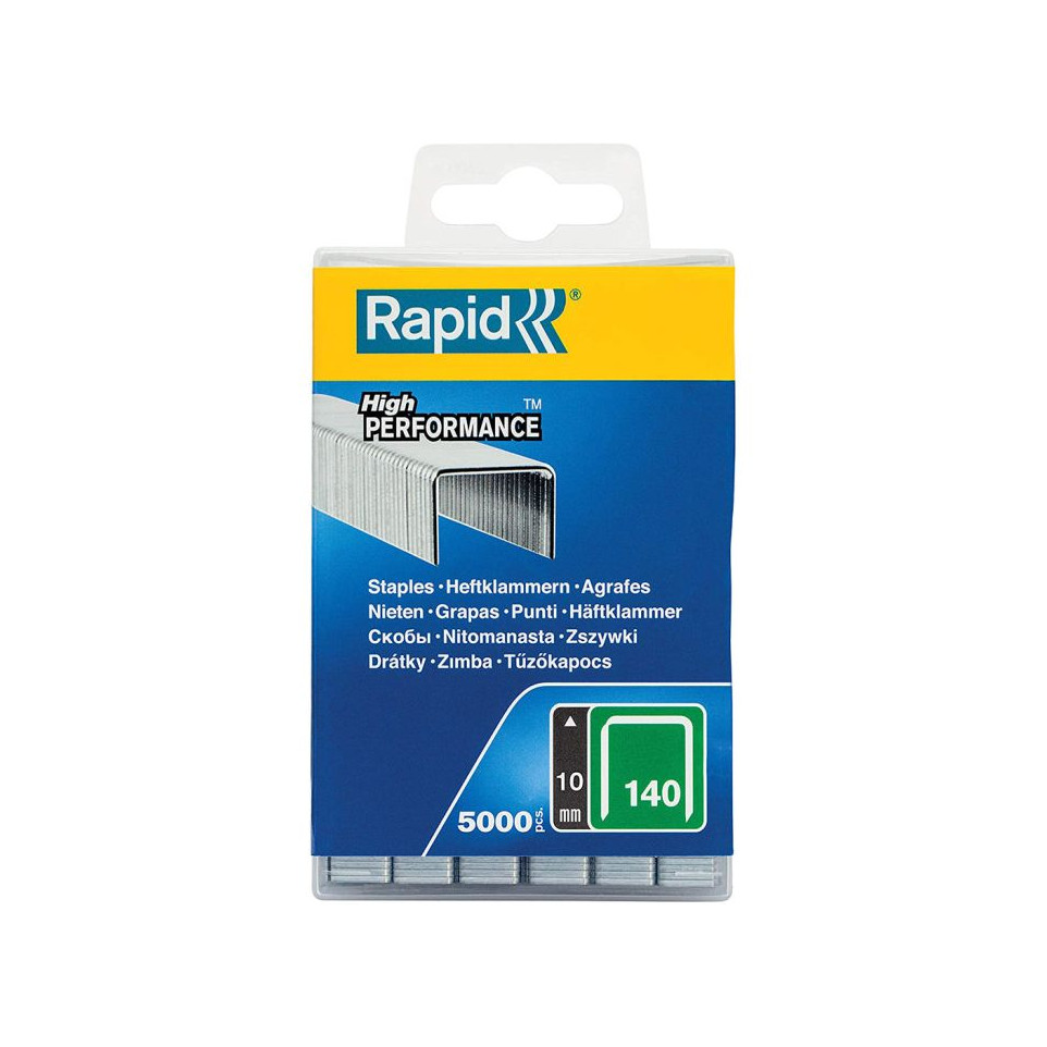 Agrafes TYPE 140 de 10 mm, conditionnées en boîte de 5000 pièces, adaptées aux agrafeuses de la marque Rapid pour travaux de fixation variés tels que l’isolation, les plastiques fins, les cartons ou les revêtements légers.