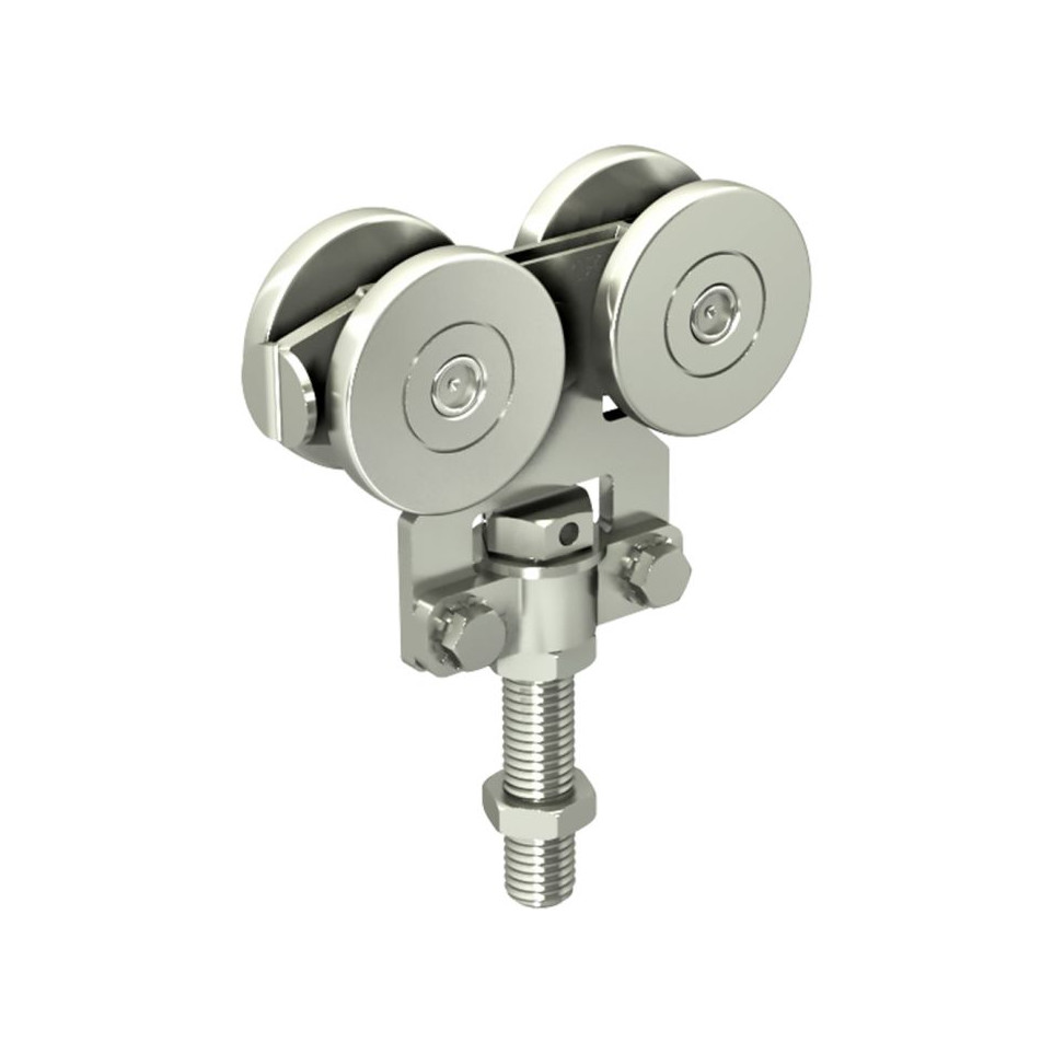 La roulette se fixe sur le chant inférieur du panneau à déplacer. Les galets, montés sur roulements à billes, assurent une translation silencieuse et régulière sur le rail SPORTUB 5040. Elle convient aux systèmes de portes coulissantes extérieures exposées aux intempéries, garantissant une longue durée de vie et des performances constantes.