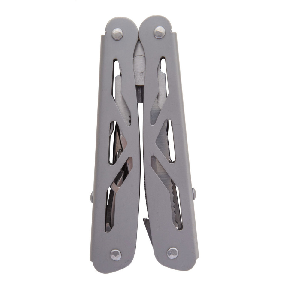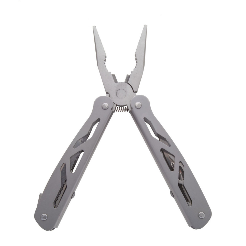 Outil multifonction compact en acier inoxydable avec 9 fonctions pratiques, livré dans un étui en polyester. Idéal pour les travaux quotidiens, le bricolage ou les situations d'urgence.