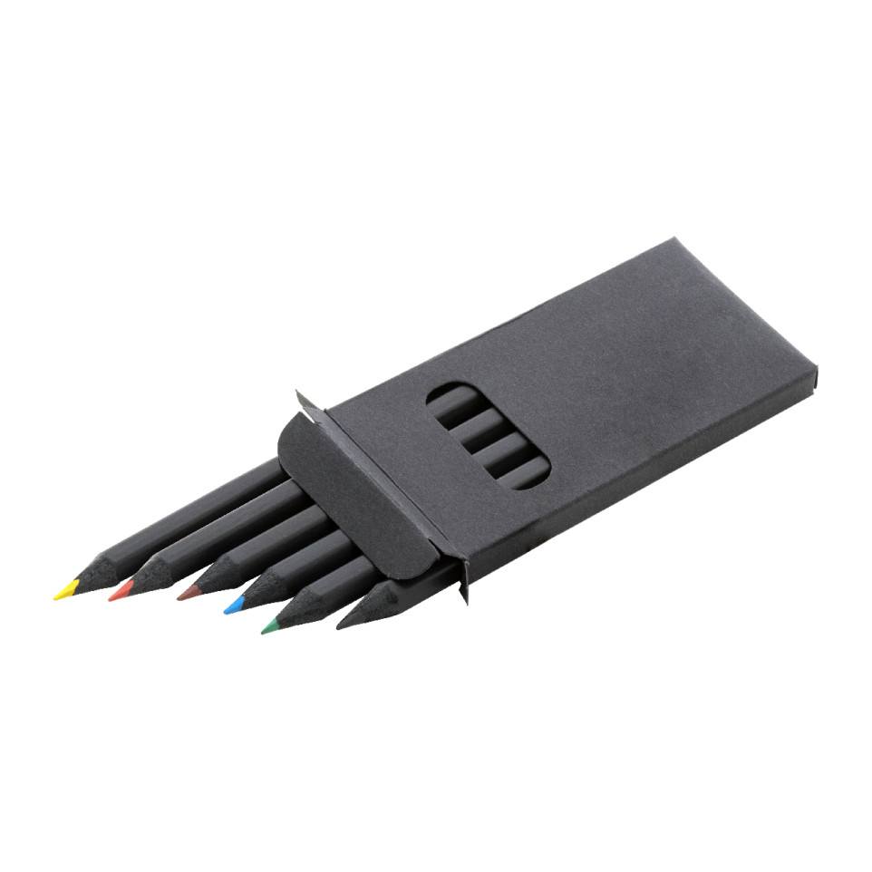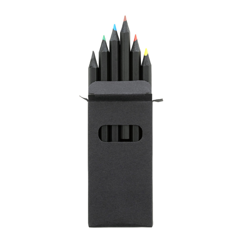Il comprend 6 crayons de couleur en bois noir, fournis dans une boîte en papier assortie.