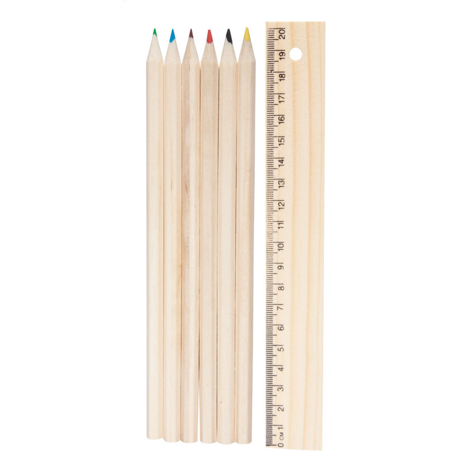 Set de coloriage pratique comprenant 6 crayons de couleur dans une boîte en bois intégrant une règle de 20 cm, idéal pour le dessin, l'apprentissage et les loisirs créatifs à l'école, au bureau ou à la maison.