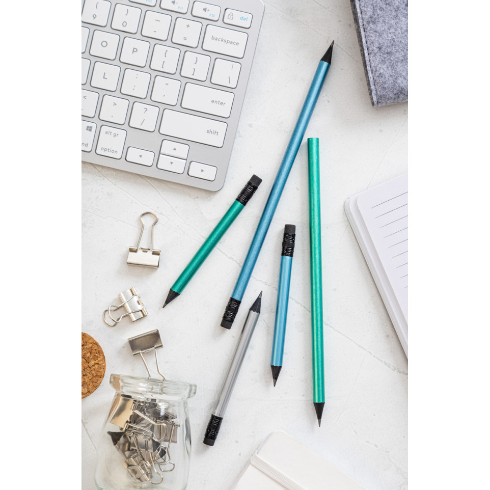 Crayon à papier mini en bois noir avec finition métallique, équipé d’une gomme noire intégrée. Mine taillée en dureté HB, idéal pour l’écriture claire ou le croquis précis lors de déplacements, sur le bureau ou pour des usages scolaires.