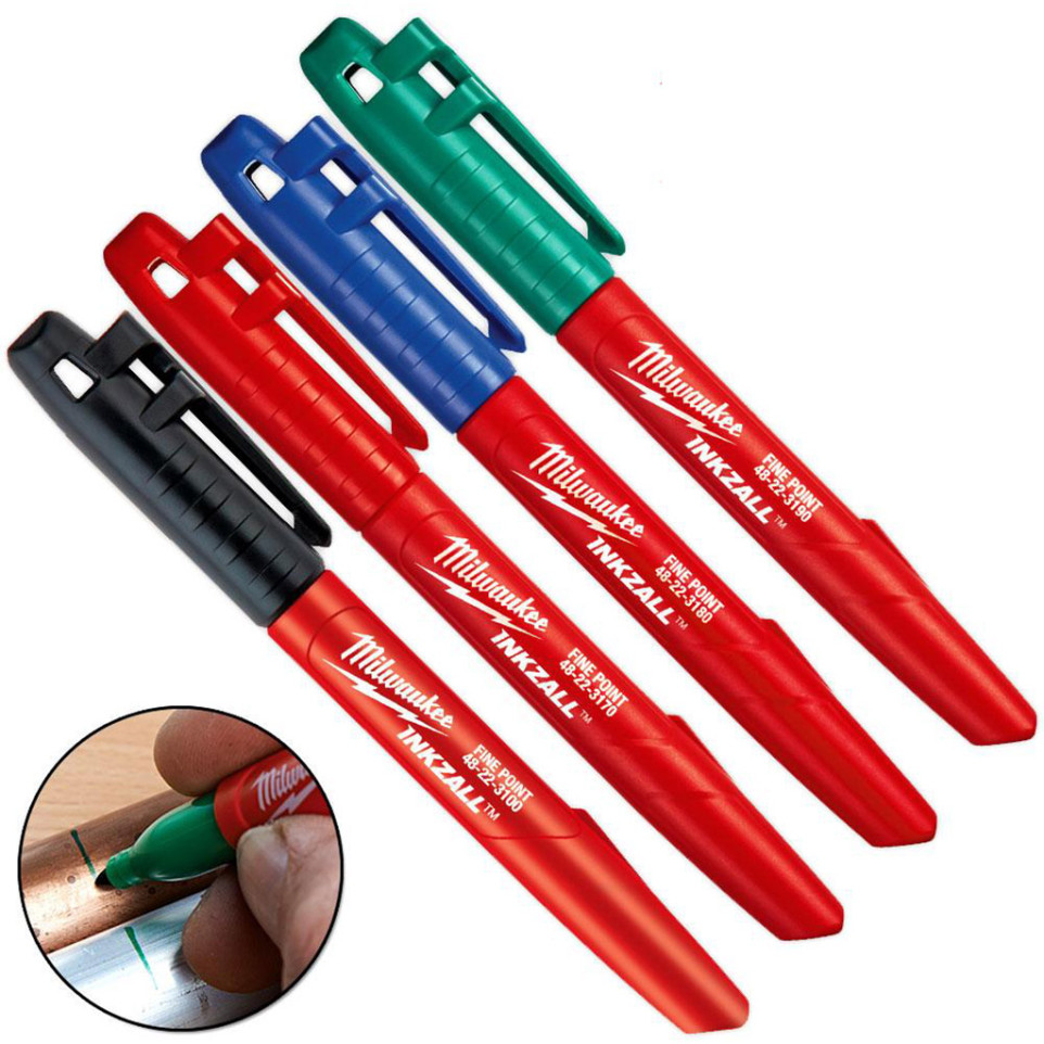 Lot de 4 marqueurs universels Milwaukee INKZALL adaptés à l’écriture sur des surfaces difficiles comme le béton, le bois, les métaux, même en présence d’huile, d’humidité ou de rouille. Conçus pour les chantiers et ateliers.