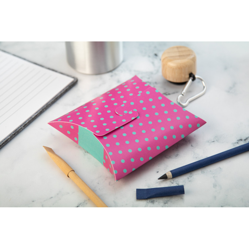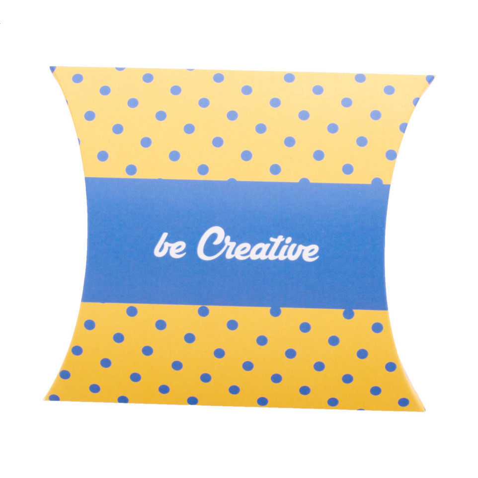 Quelle est la taille exacte de la boîte CreaBox Pillow Lock S ? La boîte mesure 123×108 mm, un format compact adapté aux petits objets promotionnels.