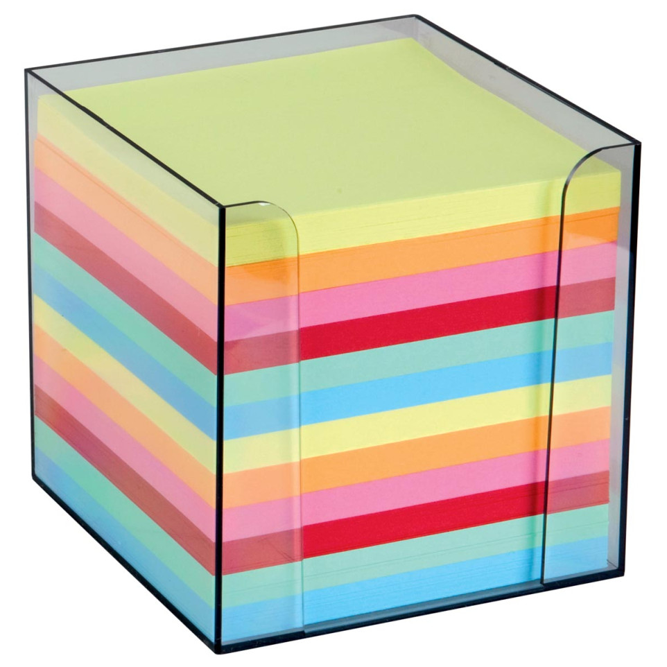 Cube-mémo compact en plastique, format 9,5 x 9,5 x 9,5 cm, contenant 700 feuillets de 9 x 9 cm en couleurs assorties. Idéal pour l’organisation au bureau ou à la maison.