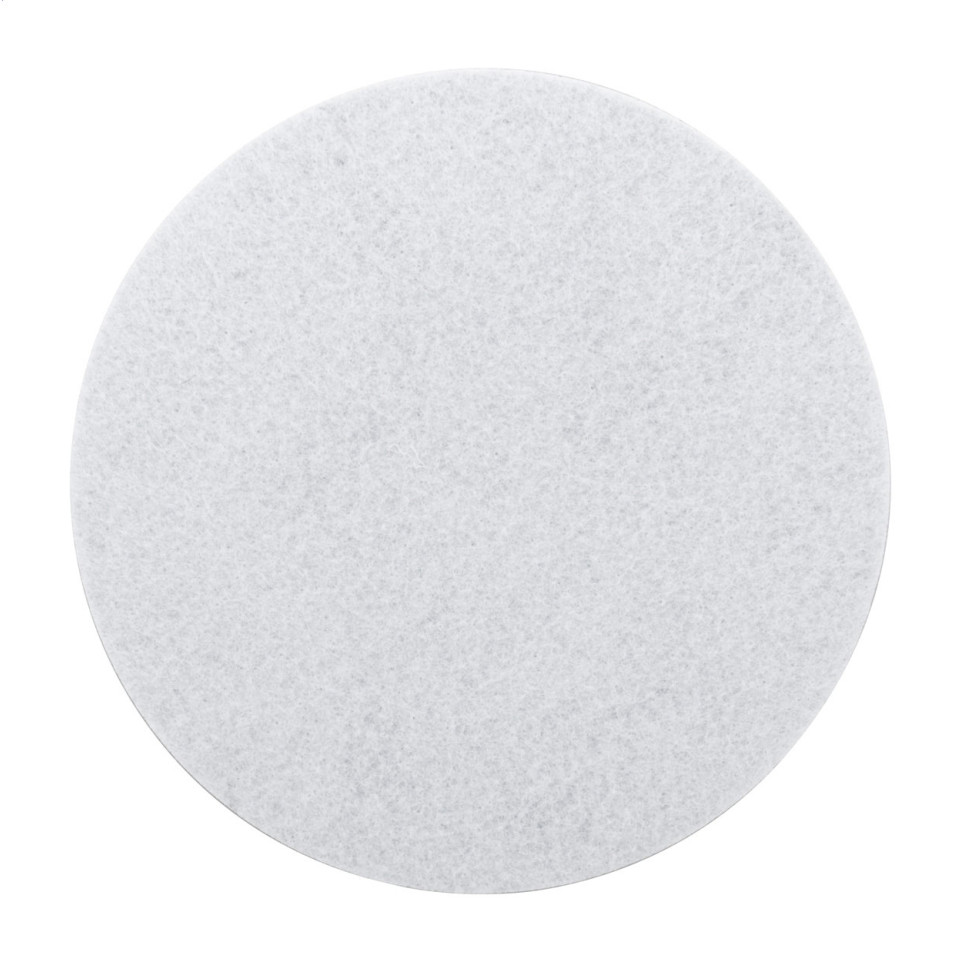 Sous-verre en feutrine RPET avec base antidérapante en caoutchouc, personnalisable par impression en sublimation quadrichromie sur une face. Idéal pour protéger les surfaces tout en affichant votre identité visuelle.
