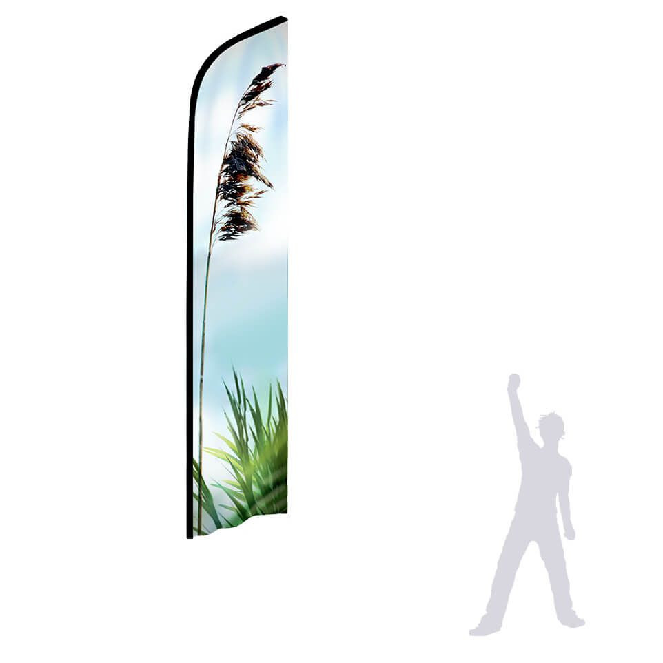 Finition : sangle de renfort latérale qui entoure le mât (choisissez entre blanc et noir ci-dessus) Impression : digitale full quadri à sublimation, taux de perçage supérieur à 95%