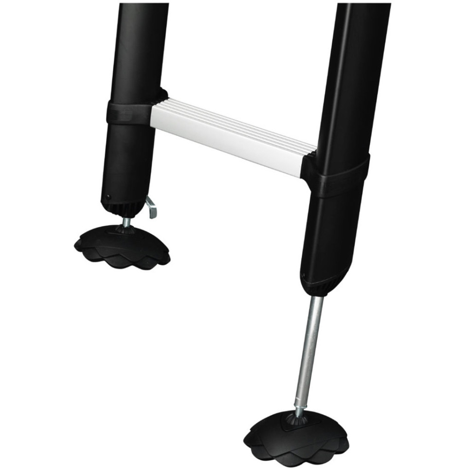 Les pieds de sécurité se fixent simplement à la base de l’échelle Telesteps et se règlent en hauteur indépendamment. Positionnez l’échelle sur la surface, ajustez chaque pied afin que l’échelle soit parfaitement en contact avec le sol, puis verrouillez pour garantir une assise sûre avant utilisation.