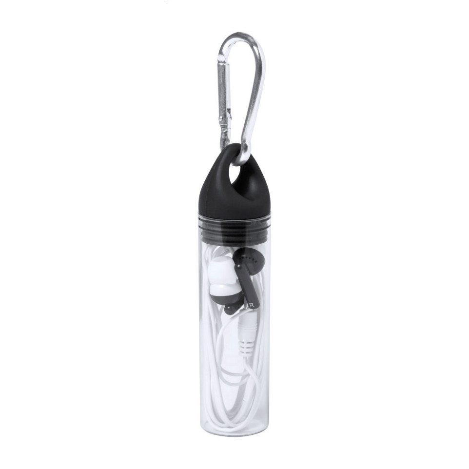 Écouteurs auriculaires Kelty, coloris noir et blanc, équipés d’une prise jack 3,5 mm. Livrés dans un étui en plastique robuste avec mousqueton et embout coordonné pour une utilisation quotidienne facile en déplacement.