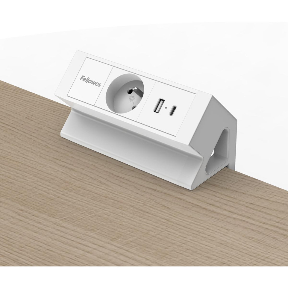 La Fellowes Power Desk est une douille de bureau compacte équipée d'une prise belge et de deux ports USB (USB-A et USB-C), conçue pour s'intégrer directement sur le bord d'un bureau grâce à sa pince de fixation.