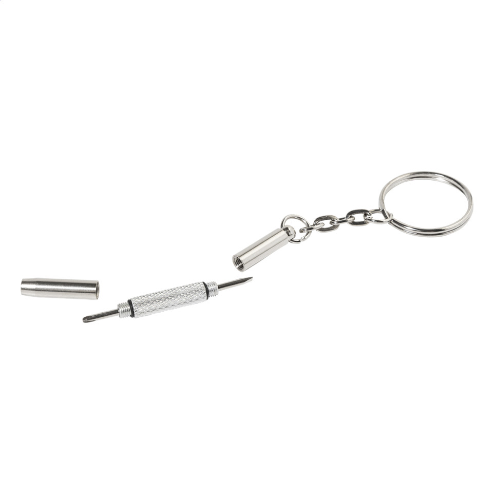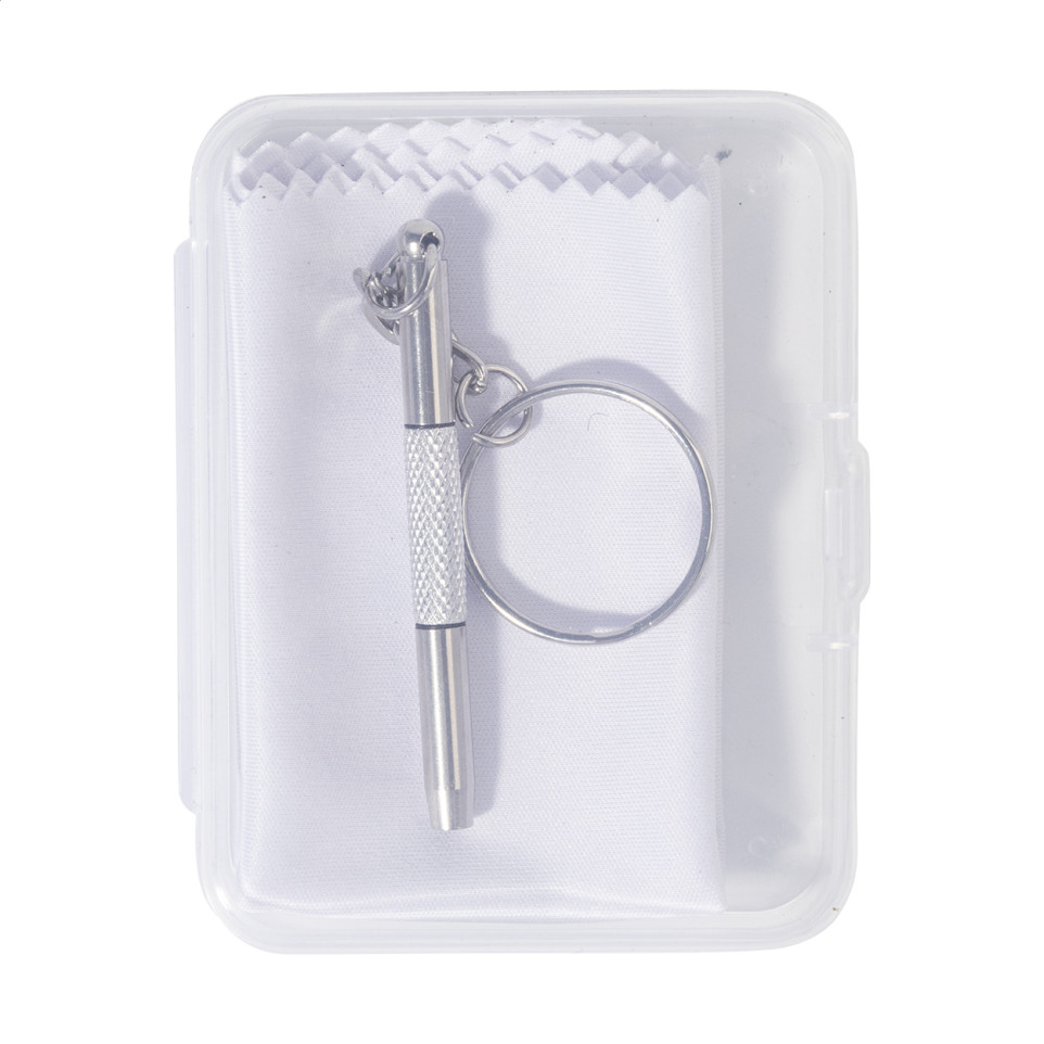 Kit de réparation compact pour lunettes, présenté dans une boîte transparente en PP. Il inclut un chiffon d’essuyage 100 % microfibre RPET et un mini tournevis avec anneau porte-clés, idéal pour entretenir ses lunettes au quotidien.