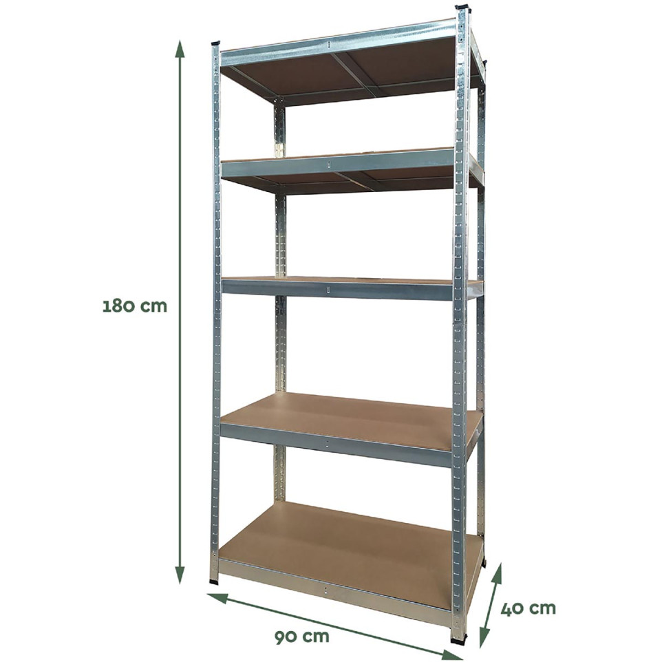 Étagère industrielle Brasq en métal, équipée de 5 tablettes robustes de 90 x 40 x 180 cm. Conçue pour optimiser le rangement dans les ateliers, espaces de stockage ou garages.