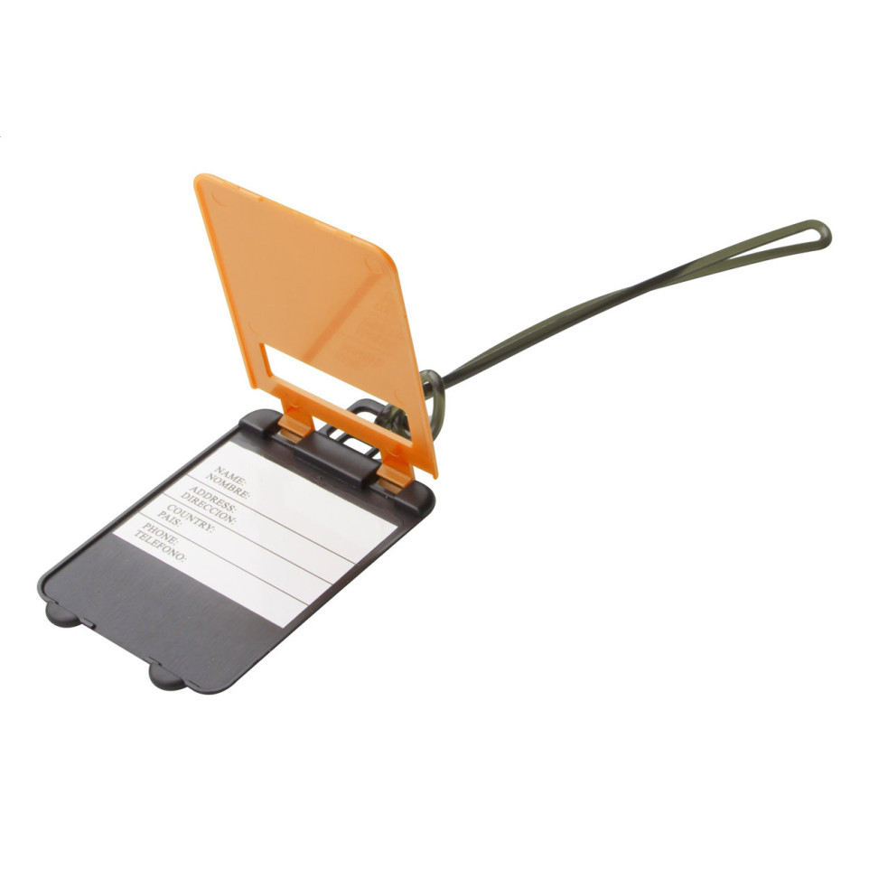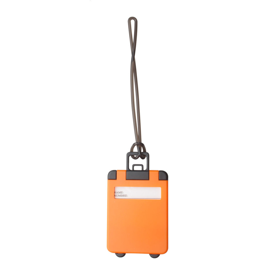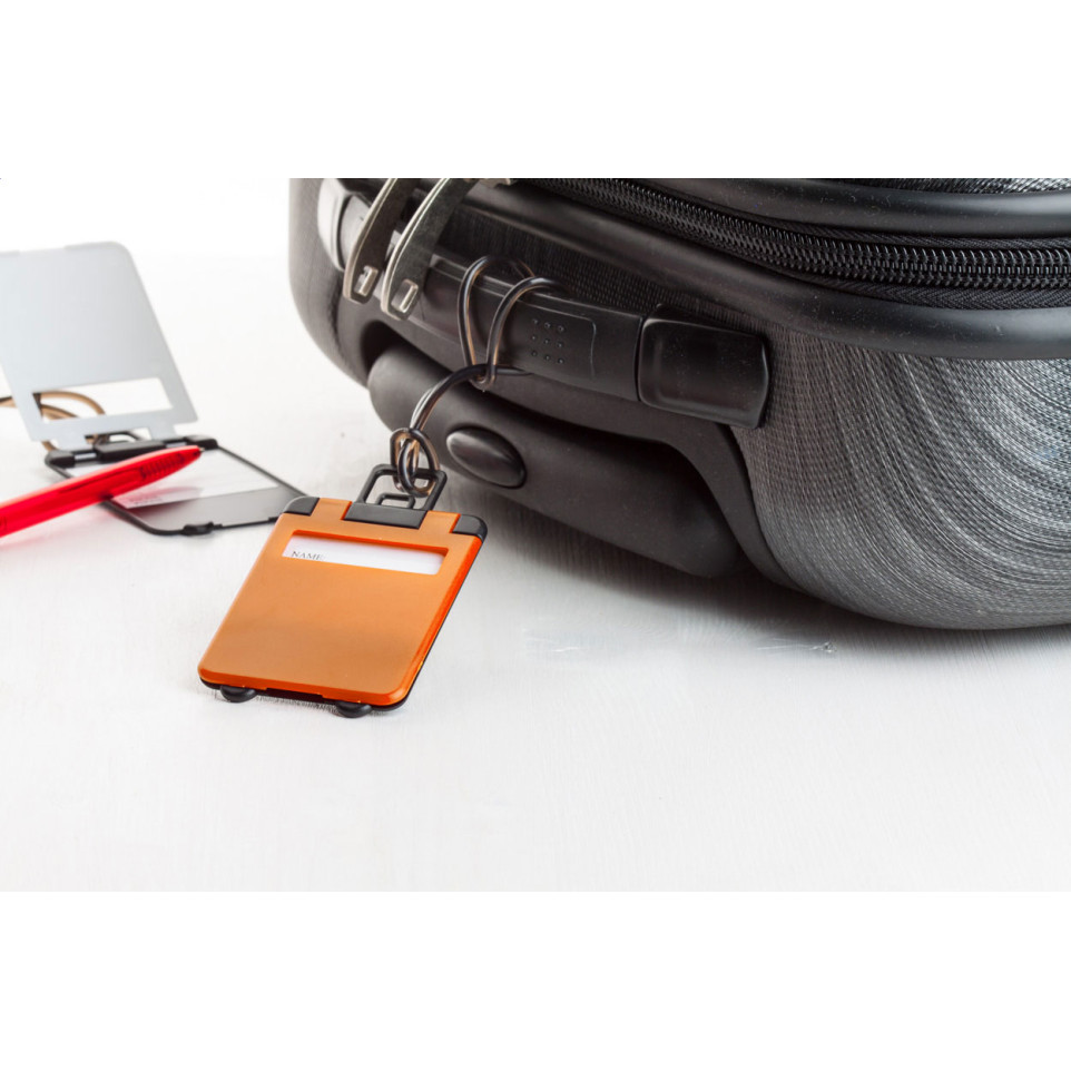 Étiquette à bagages en plastique coloris orange, robuste et légère, conçue pour identifier rapidement vos bagages lors de vos déplacements professionnels ou personnels. S’attache facilement à toutes les valises et sacs de voyage.