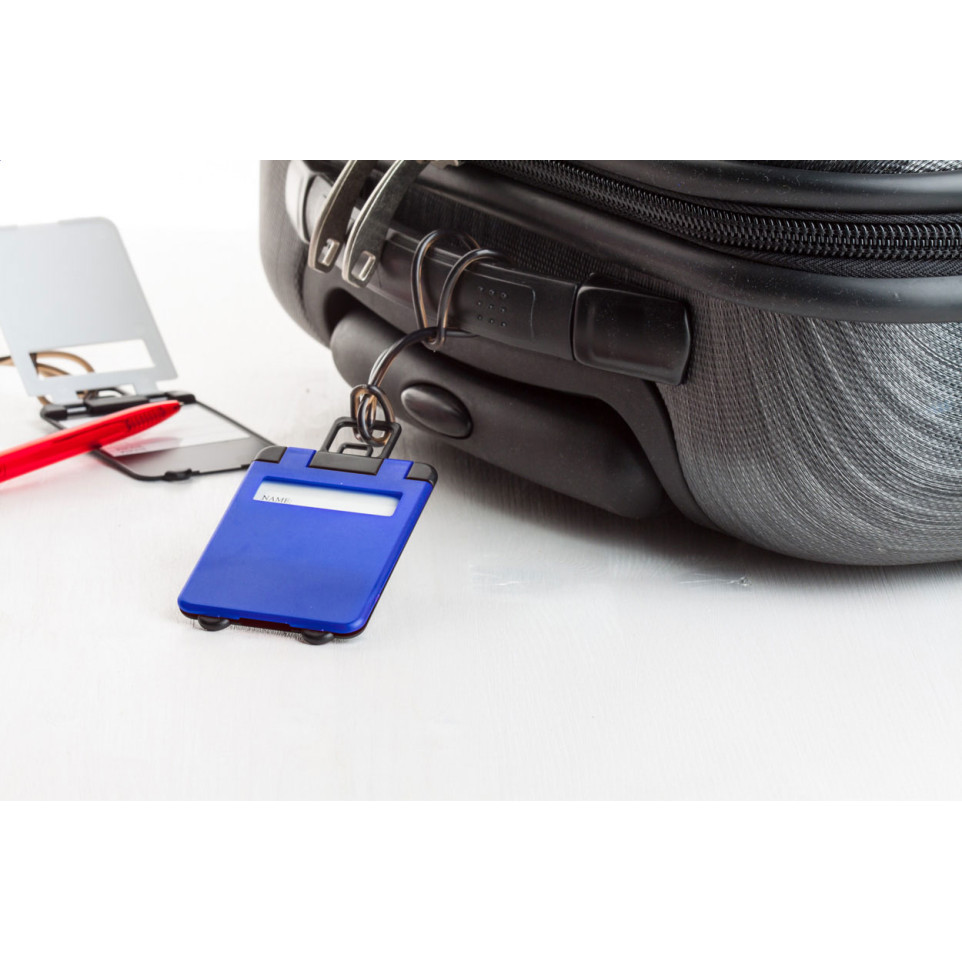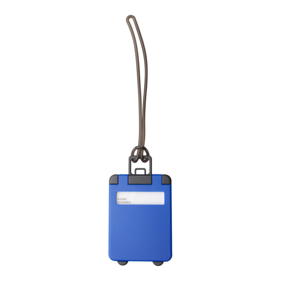 Étiquette à bagages en plastique bleu, conçue pour identifier facilement vos valises et sacs lors de vos déplacements professionnels ou personnels. Elle offre un repérage rapide et sécurise vos effets personnels pendant vos voyages.