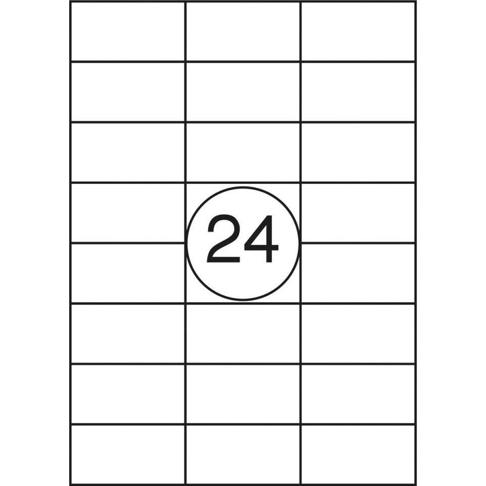 Étiquettes blanches multifonctionnelles OFFICE products, au format 70 x 37 mm, avec coins carrés. Présentées en boîte de 100 feuilles A4, chaque feuille offre 24 étiquettes, soit un total de 2 400 étiquettes. Idéal pour le classement, l’expédition ou l’archivage en environnement de bureau.