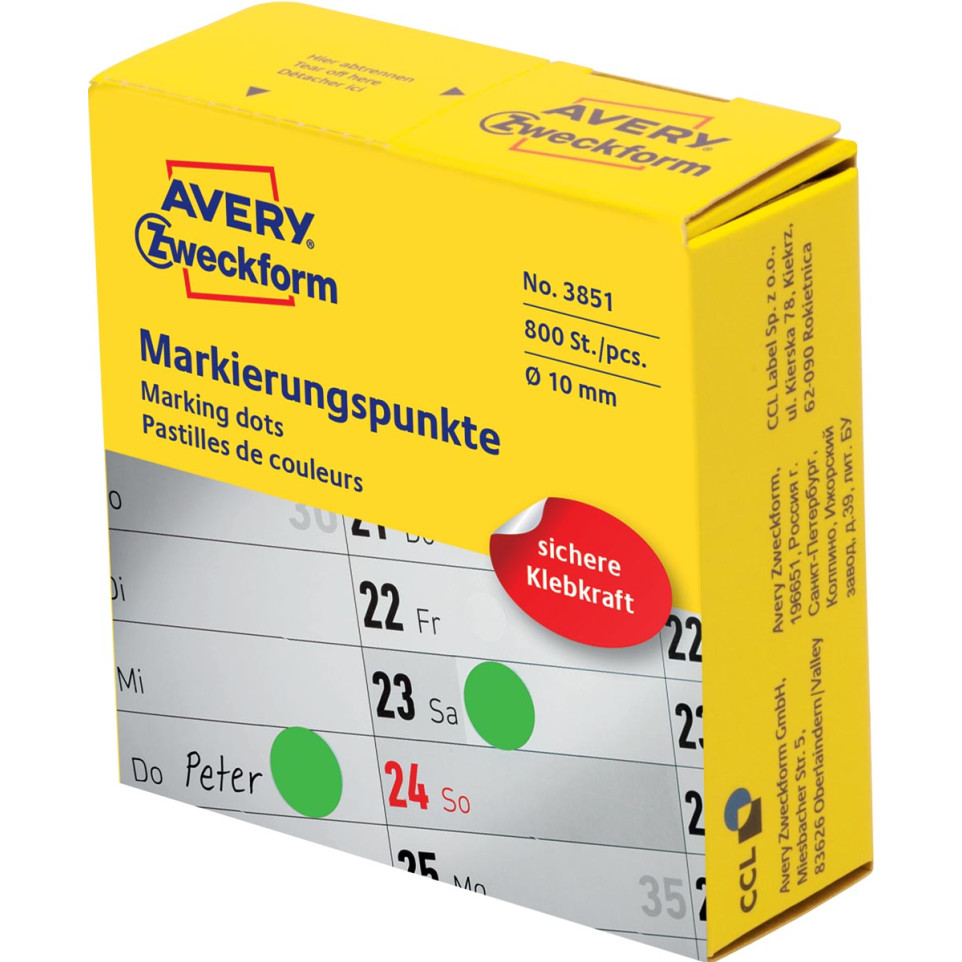 Les pastilles de marquage Avery Zweckform vertes, d’un diamètre de 10 mm, sont conditionnées en rouleau de 800 pièces. Idéales pour signaler, identifier, classer et coder des documents ou produits dans les environnements professionnels ou éducatifs.