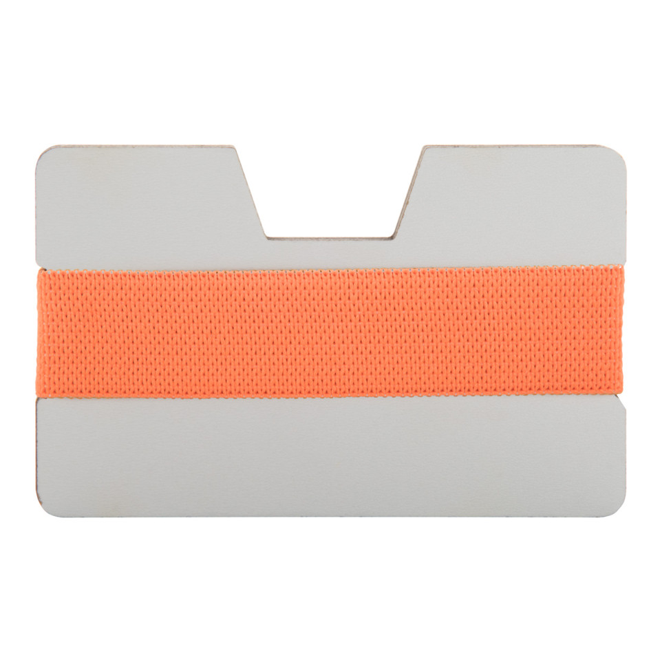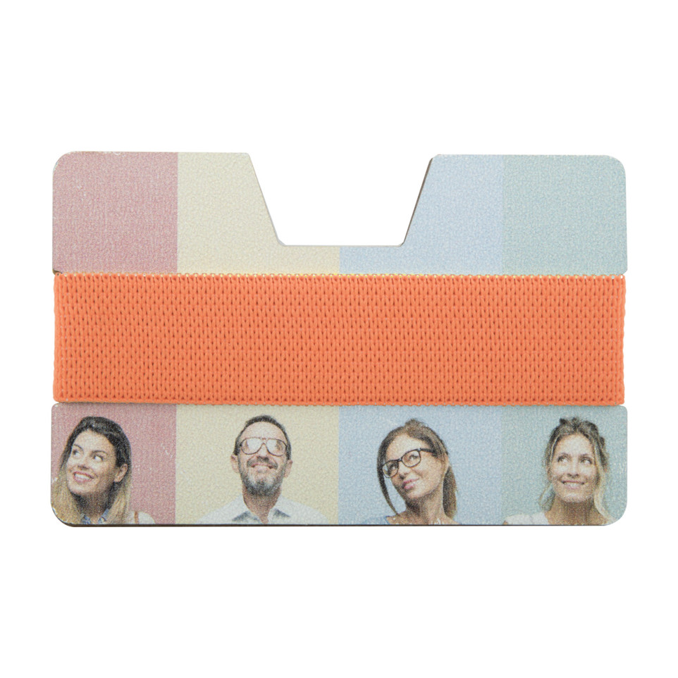 Porte-cartes moderne en bois HDF et bande élastique orange et blanche, conçu pour organiser cartes de crédit ou de visite de façon compacte et élégante au quotidien.