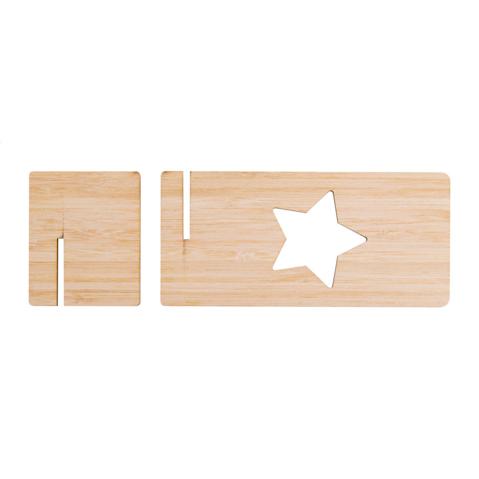 Support de bureau pour téléphone en contreplaqué de bambou, avec découpe en forme d’étoile inspirée des motifs de Noël. Pratique et élégant, il s’intègre parfaitement aux espaces de travail à domicile ou au bureau.