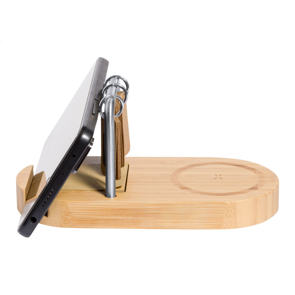 Voir des produits similairesChargeur sans fil multifonctionnel en bambou naturel offrant une solution élégante pour charger votre téléphone tout en intégrant un support pratique et un calendrier perpétuel sur cadre métallique.