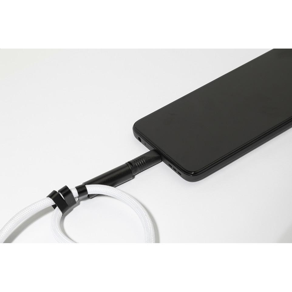 Bracelet porte-téléphone en RPET recyclé, conçu pour transporter son smartphone au poignet tout en intégrant un câble chargeur USB-C vers USB-C pour une recharge rapide jusqu'à 60 W.