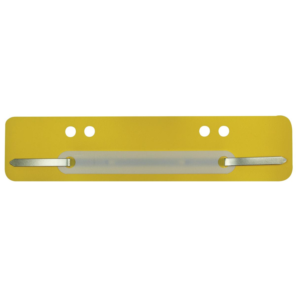 Fixe-dossiers jaune Merkloos, conditionné en boîte de 100 pièces, dimensions 150 x 38 mm. Idéal pour organiser et maintenir des documents dans des classeurs, dossiers suspendus ou chemises de classement au bureau ou à l’école.
