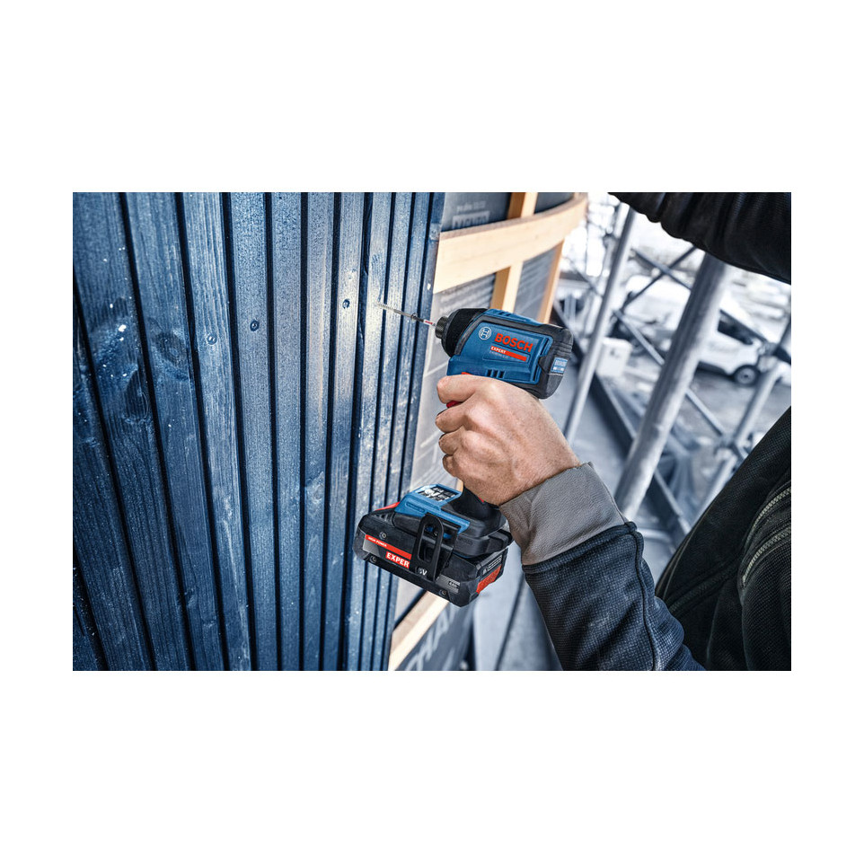 Insérez une batterie Bosch Professional 18V compatible dans l'outil. Sélectionnez le mode de vissage et le réglage de vitesse adaptés à votre application via les commandes intégrées sur le corps de la machine. Placez l'embout souhaité dans le porte-embout hexagonal d'une seule main. Appliquez l'outil sur la vis ou le boulon et actionnez la gâchette progressive pour visser ou dévisser avec précision.