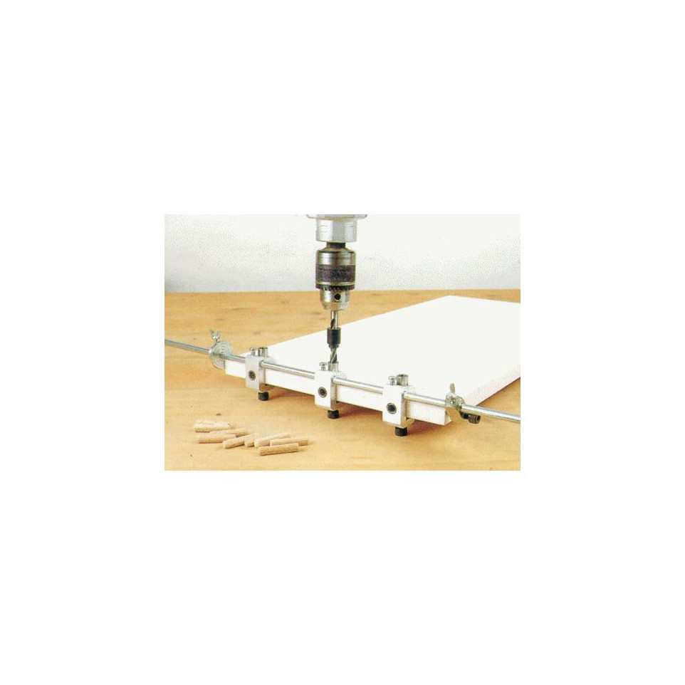 Le guide se fixe simplement sur le panneau à assembler. L’utilisateur perce à travers le guide à l’aide d’une mèche de 8 mm, garantissant un alignement parfait des trous pour insérer ensuite les tourillons en bois. L’outil ne nécessite aucun réglage complexe et s’utilise aussi bien sur bois massif que sur panneaux de particules.