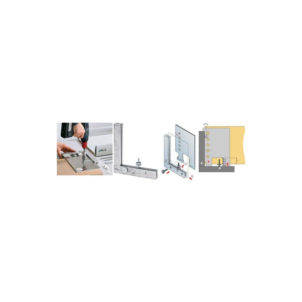 La butée s’installe directement sur le gabarit de perçage Practica et sert de repère pour positionner les éléments à assembler. Il suffit de l’ajuster à la mesure requise pour garantir la régularité et la précision des trous destinés au montage des tiroirs ou caissons selon les systèmes compatibles.