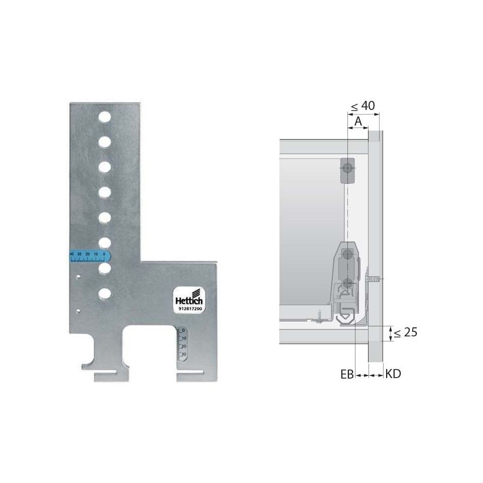 Gabarit de perçage Hettich Practica conçu pour l'installation précise de la fixation de façade sur les tiroirs et tiroirs à casseroles ArciTech, y compris les versions à deux niveaux de tringles. Indispensable pour tout projet de montage de systèmes ArciTech.