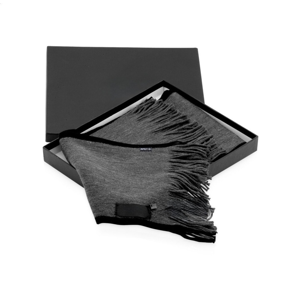 Écharpe élégante confectionnée en polyester recyclé (RPET), idéale pour accompagner vos tenues en toutes saisons. Présentée dans une boîte cadeau noire, elle allie esthétique moderne et engagement écologique.