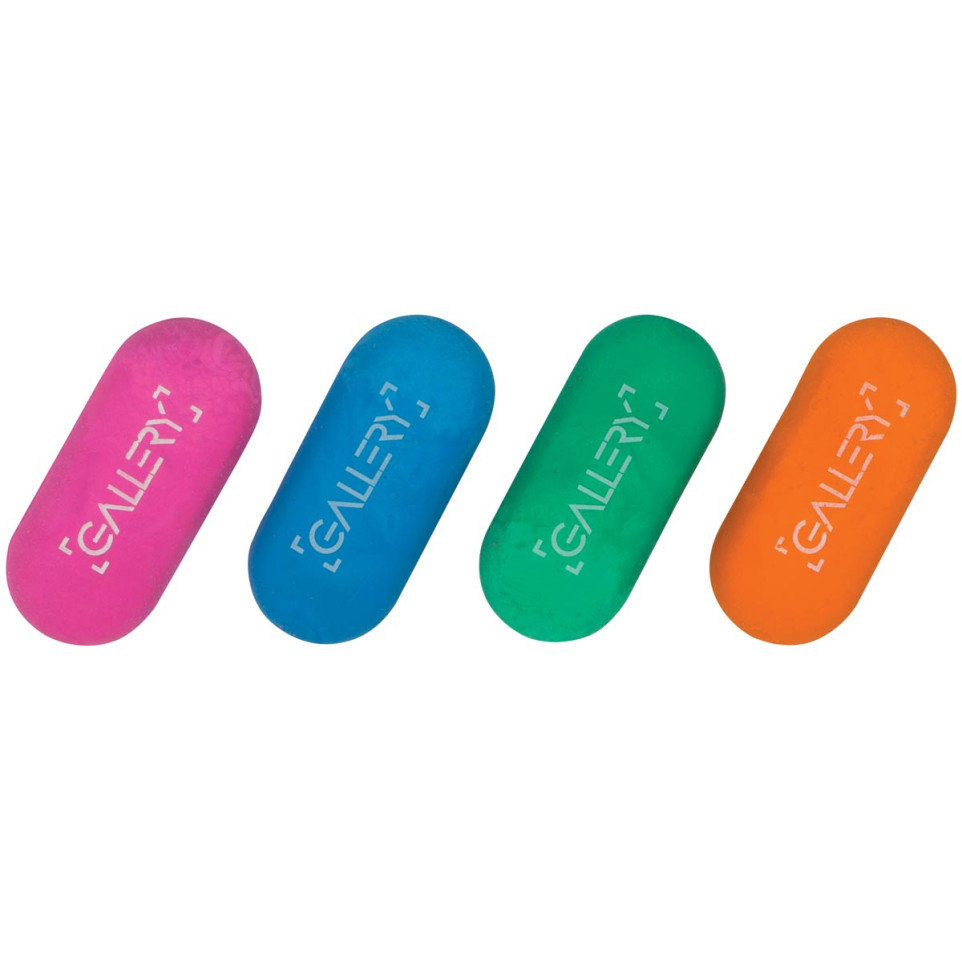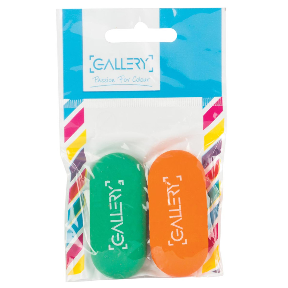 La gomme Passion For Colour de Gallery se présente en blister de 2 pièces, offrant des couleurs assorties bleu et rose, vert et orange. Elle est conçue pour effacer proprement tout type de trace de crayon sur papier.