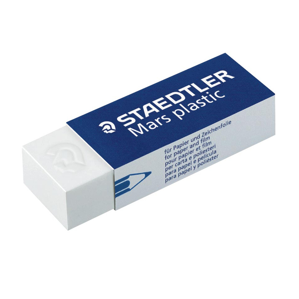 Gomme plastique de qualité professionnelle Staedtler Mars Plastic, conçue pour effacer proprement le crayon graphite sur papier, calque, polyester, ou film. Format pratique, livrée en boîte de 20 pièces pour un usage intensif ou collectif.
