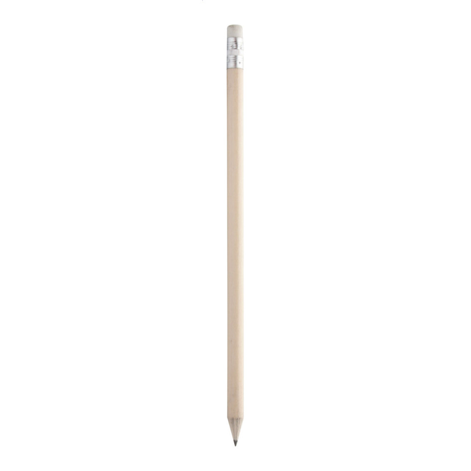 Crayon à papier beige avec gomme intégrée, muni d’une mine HB idéale pour l’écriture et le dessin au quotidien en milieu scolaire, professionnel ou lors d’événements promotionnels.