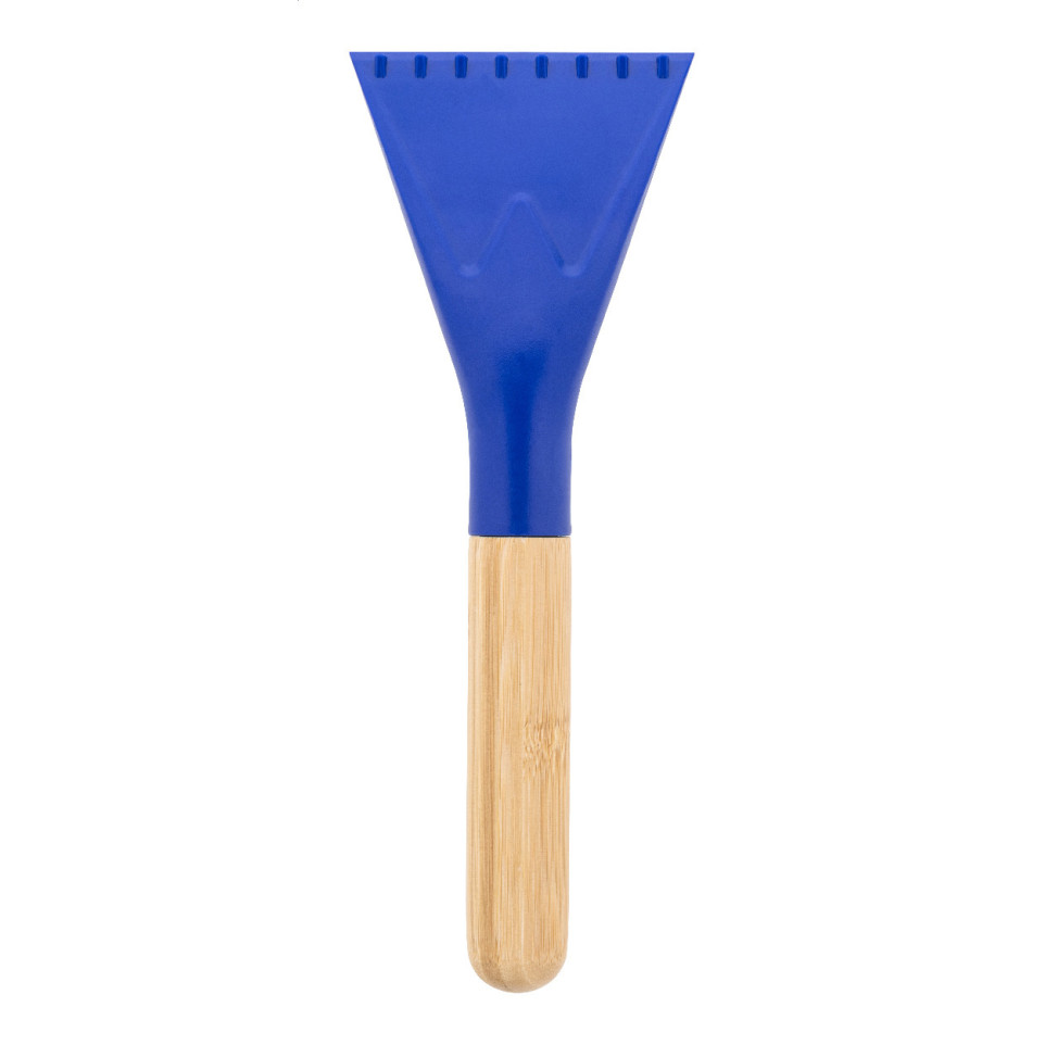 Grattoir à glace Rambek bleu conçu en ABS recyclé avec un manche en bambou confortable. Adapté pour dégivrer rapidement pare-brises et fenêtres lors des périodes hivernales, il allie fonctionnalité et conscience environnementale.