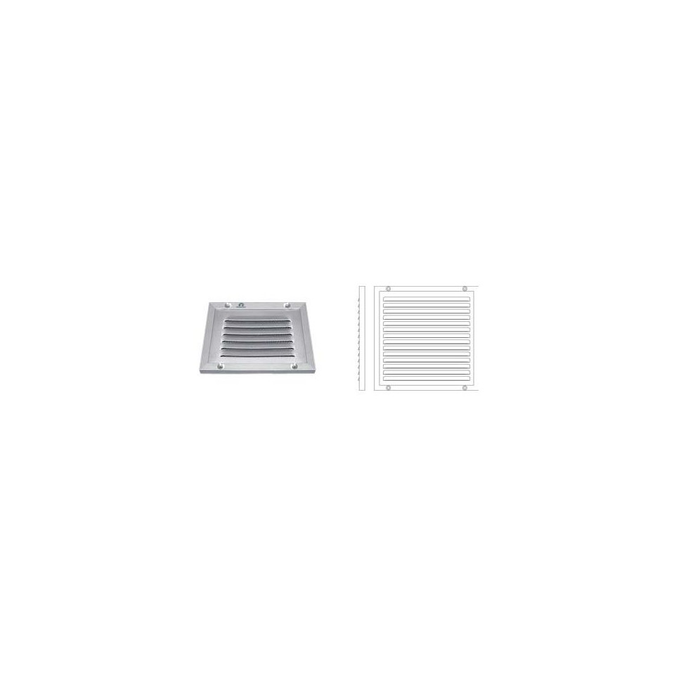 Grille estampée avec cadre et moustiquaire intégrée, idéale pour la ventilation des traversées murales dans les espaces résidentiels ou tertiaires. Format standard de 150x150 mm, finition aluminium naturel, conçue pour une intégration discrète et résistante.