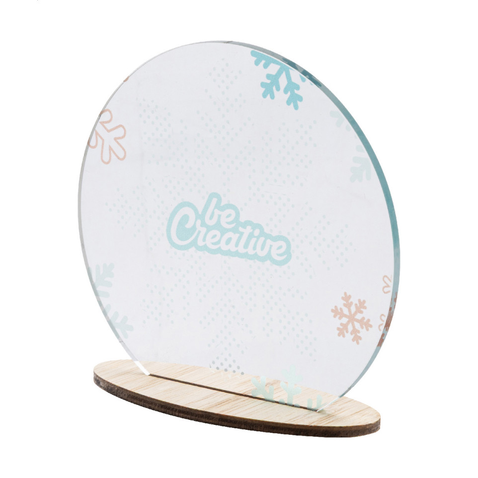 Décoration de Noël personnalisable en forme de boule de neige fabriquée en acrylique transparent, montée sur un support en bambou. Idéale pour habiller sapins, vitrines ou bureaux lors des fêtes de fin d’année et valoriser votre image.