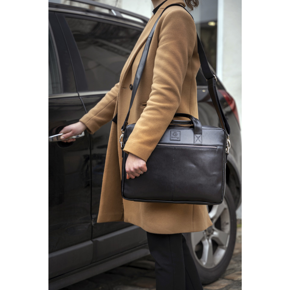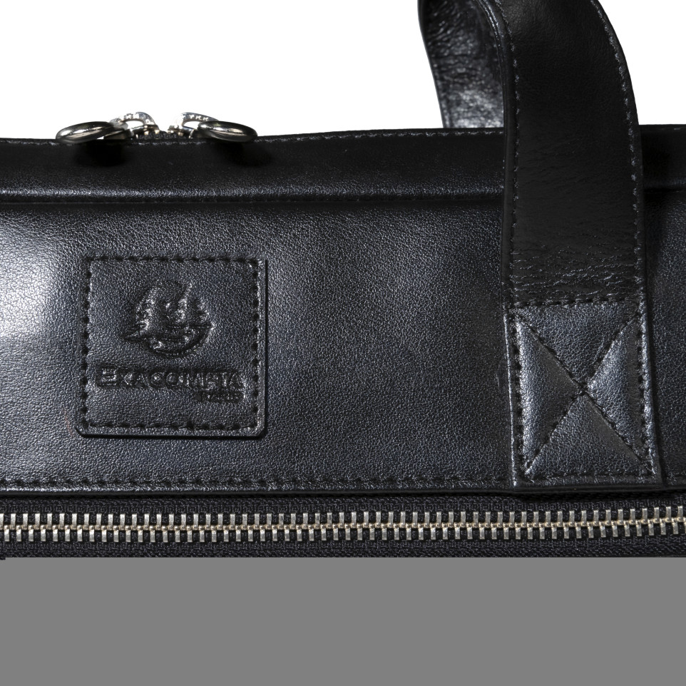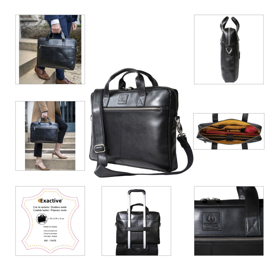 Sacoche ordinateur Exactive Cuir noir Dans la lignée du style sobre et élégant de la gamme Exactive, la bagagerie cuir séduira les actifs qui cherchent la qualité et le chic au meilleur prix. En cuir vachette, matière haut de gamme, résistante à l'eau comme à l'usure, la sacoche Exactive Cuir présente un style épuré pour t ransporter l'indispensable. A l'intérieur la sacoche est équipée d'une poche renforcée et fermée adaptée aux ordinateurs portables jusque 15,6, un compartiment pour transporter les dossiers, de nombreux emplacements pour ranger stylos et cartes, mais aussi 2 poches dont une fermée pour les smartphones, et enfin une large poche zip pour les objets précieux ou en vrac. A l'extérieur la sacoche présente également une large poche fermée avec zip. Elle dispose d'un passant au dos pour glisser la sacoche sur une poignée télescopique de bagage. Avec sa poignée confortable, la sacoche peut être portée à la main, mais également sur l'épaule grâce à sa bandoulière amovible réglable.