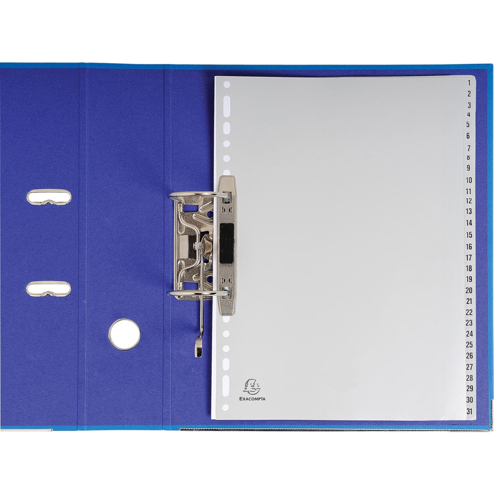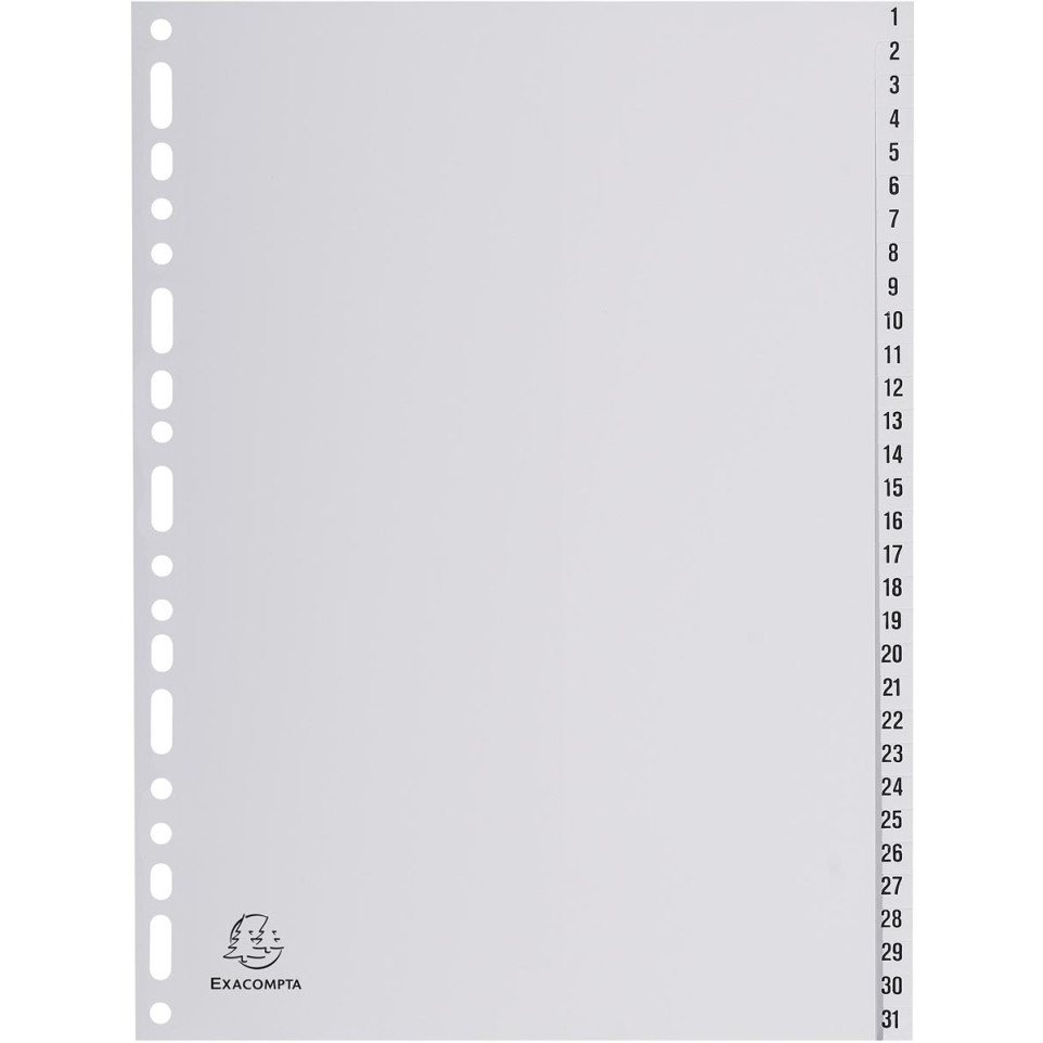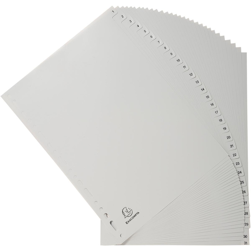 Intercalaires numériques Exacompta pour format A4, composés de 31 onglets en polypropylène gris souple, idéals pour organiser et classer efficacement documents, dossiers administratifs ou scolaires dans tout type de classeur ou reliure.