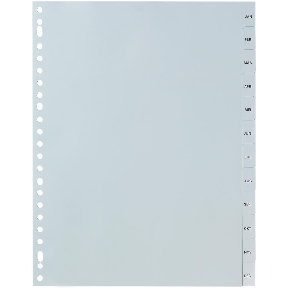 Intercalaires mensuels Pergamy format A4, en polypropylène gris, conçus pour organiser efficacement vos dossiers de janvier à décembre avec perforation à 23 trous adaptée aux classeurs à levier, étiquetage en néerlandais.
