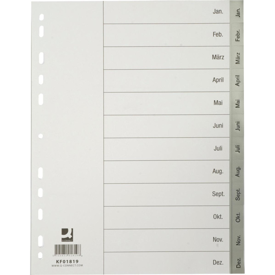 Jeu d’intercalaires mensuels Q-CONNECT format A4, conçus en polypropylène gris, dotés d’une page de garde et d’une perforation à 4 trous, idéal pour classer vos documents de janvier à décembre en langue allemande.