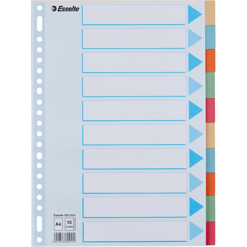 Jeu d’intercalaires Esselte 10 onglets conçu pour organiser efficacement les dossiers A4 dans les classeurs. Idéal pour le tri visuel de documents grâce à ses onglets colorés et sa perforation 23 trous pour une compatibilité maximale.