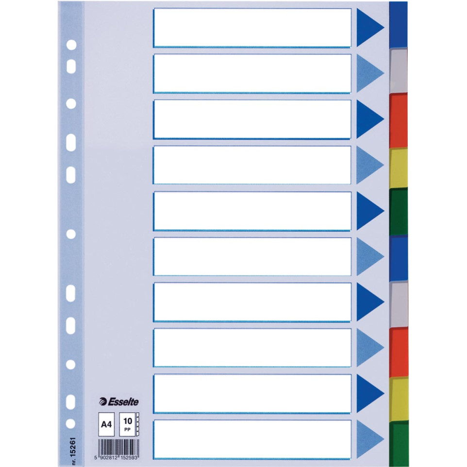 Intercalaires Esselte 10 onglets conçus pour le classement des documents au format A4. Idéals pour organiser des dossiers en environnement de bureau, scolaire ou administratif. Compatibles avec tout type de classeur à anneaux.