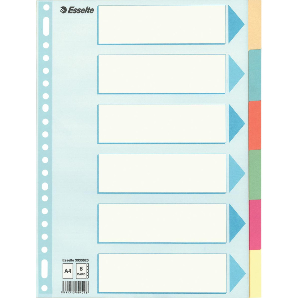 Intercalaires Esselte 6 onglets pour format A4, conçus en carton robuste 275 g/m². Idéals pour structurer et séparer vos documents dans tout classeur ou dossier à usage professionnel, éducatif ou personnel.