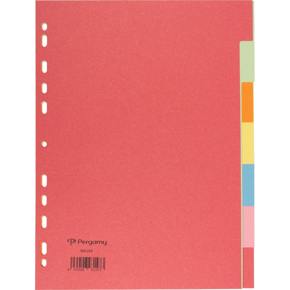 Intercalaires Pergamy au format A4, dotés de 7 onglets en couleurs assorties pastel, fabriqués en carton manilla extra solide de 225 g/m² et munis d’une perforation à 11 trous pour un classement flexible et durable de vos documents au bureau ou à la maison.